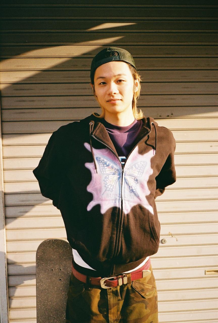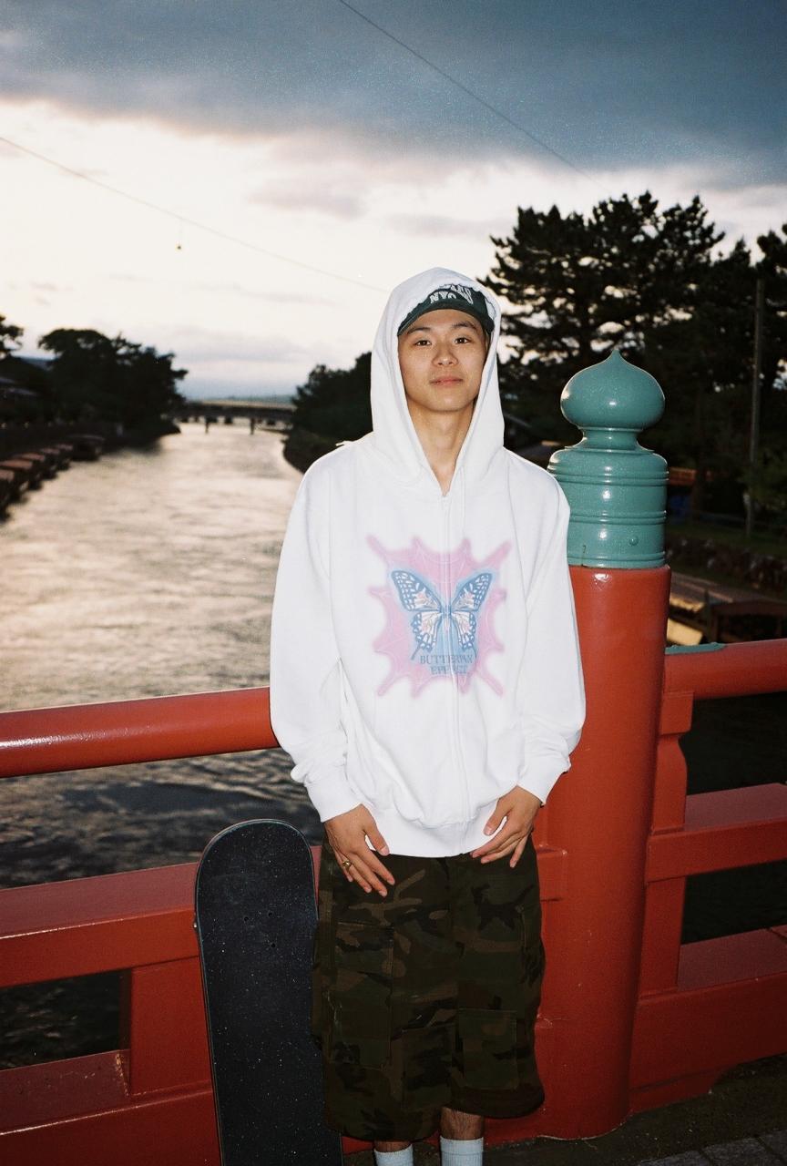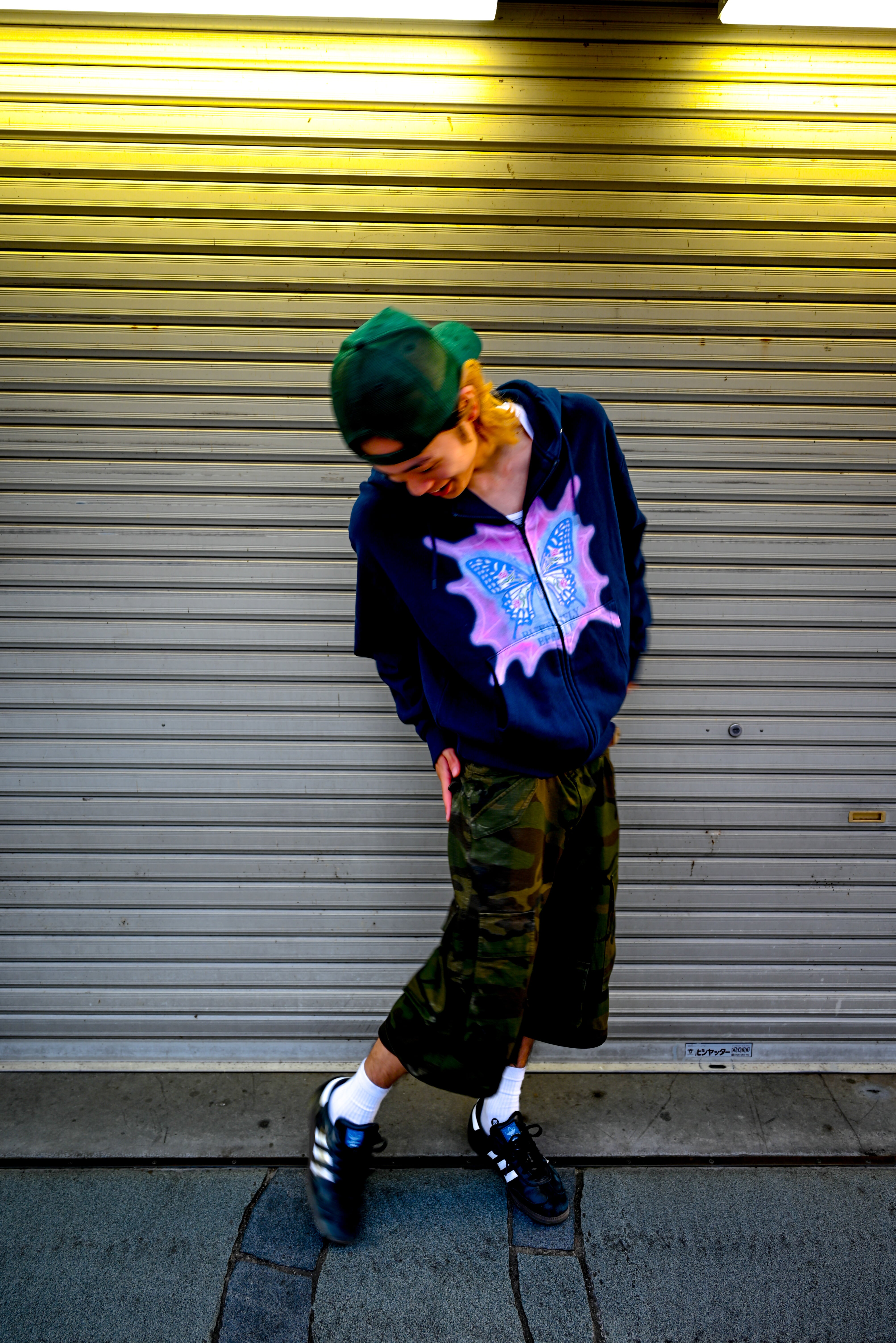 フロントには大胆な蝶のグラフィックをエアブラシで描いたような仕上がりにプリント。